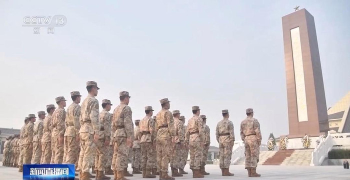太行山下,黄土岭战役胜利纪念碑前,第82集团军某旅官兵脱帽肃立,垂首默哀。官兵们面向党旗庄严宣誓,誓言铮铮,彰显人民军队铭记历史、捍卫和平的坚定决心。